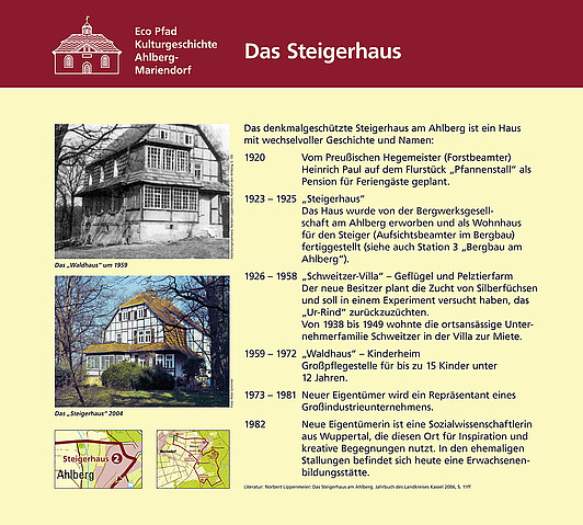 Beim Ausbau der Bushaltestelle wurden 2005 die Fundamentreste des 1788/89 erbauten Steigerhauses freigelegt. Zweihundert Meter entfernt in nördlicher Richtung steht das Haus, in dem der Steiger nach Abbruch des alten Hauses von 1922 bis 1925 wohnte.
